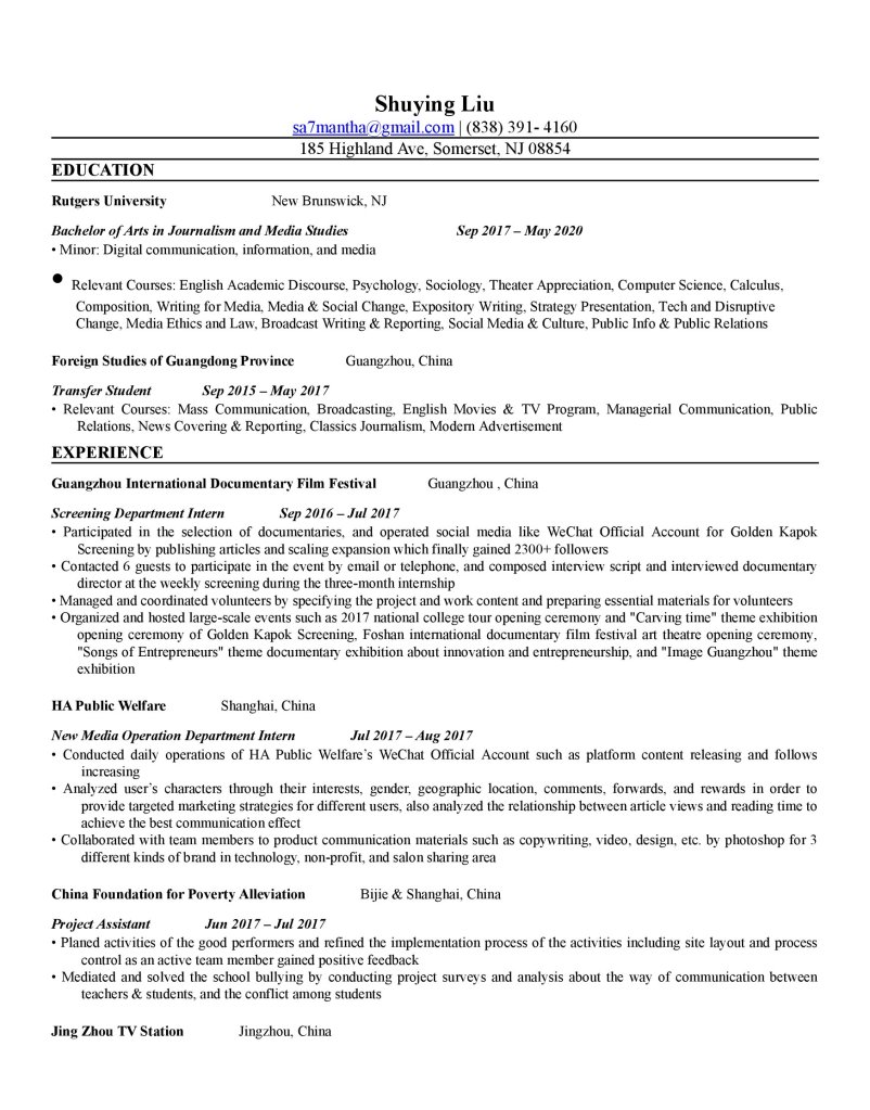 Hello! I’m Shuying Liu. I love trying and challenging new things. I am currently a student studying journalism, graduating in May, and will soon begin a new course of study in September as well.